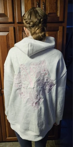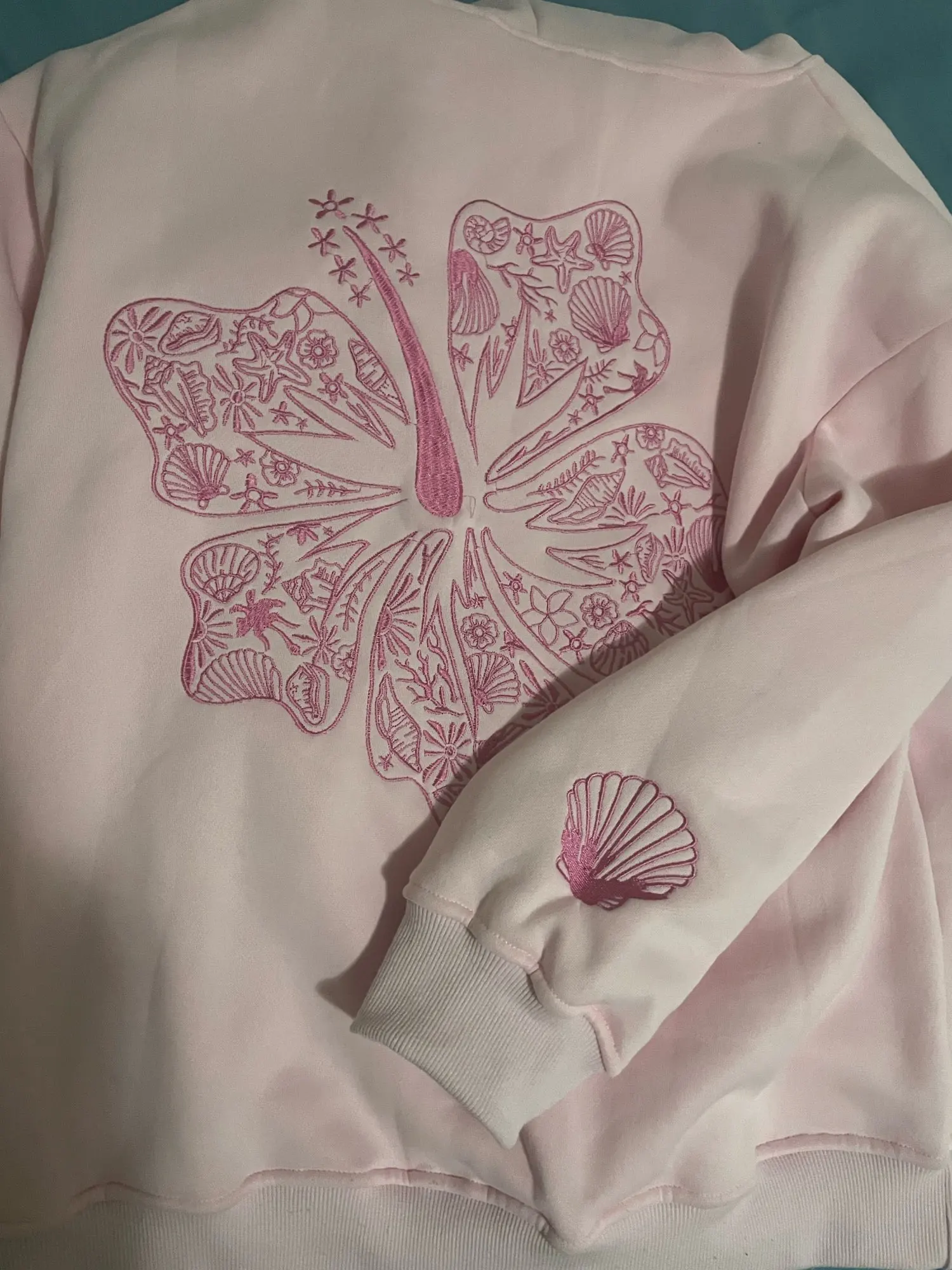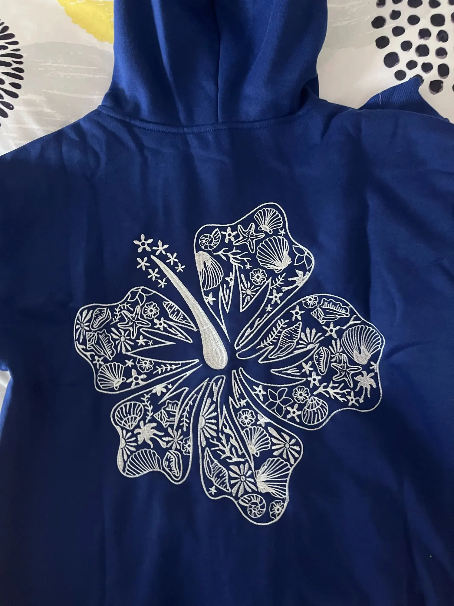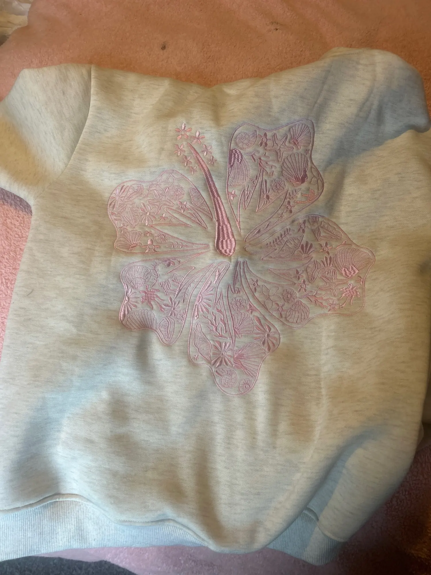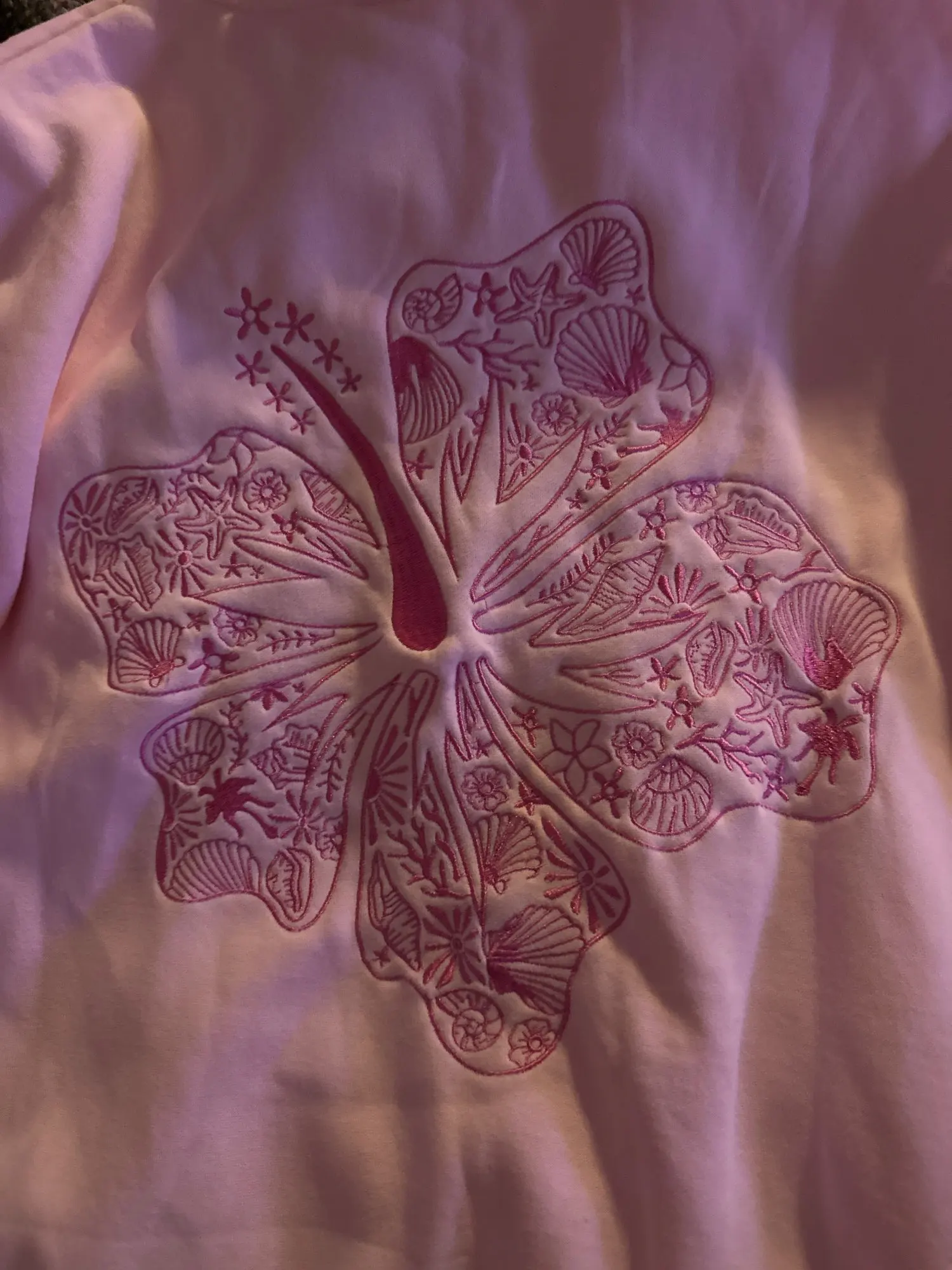 Beautiful detailed embroidered hawaiian hibiscus on back, embroidered shell on sleeve & embroidered palm tree on chest. This hoodie is awesome, very soft and thick. This superior seller did an awesome job and shipped super fast-arrived quickly 6 days after the order was placed. Highly recommend ordering from this seller. My daughter loved the first one we ordered so much that we ordered one for her friends birthday. Completely satisfied.