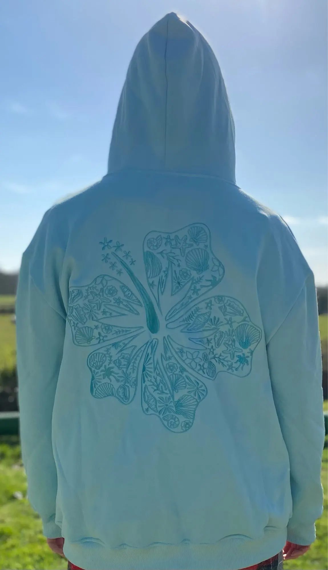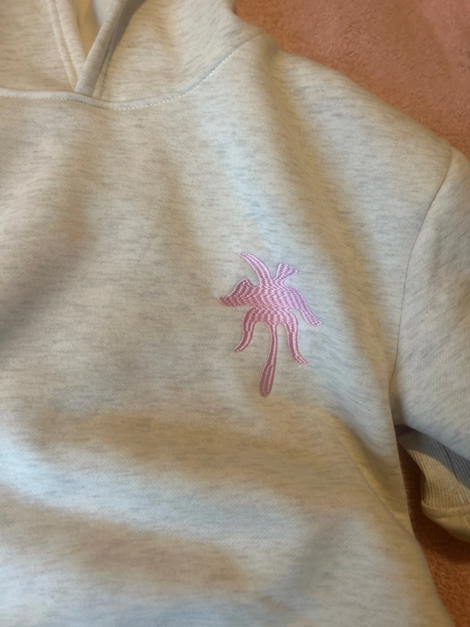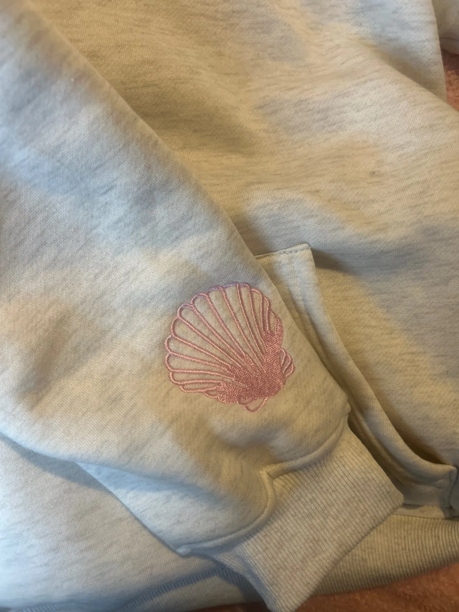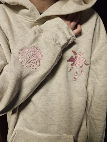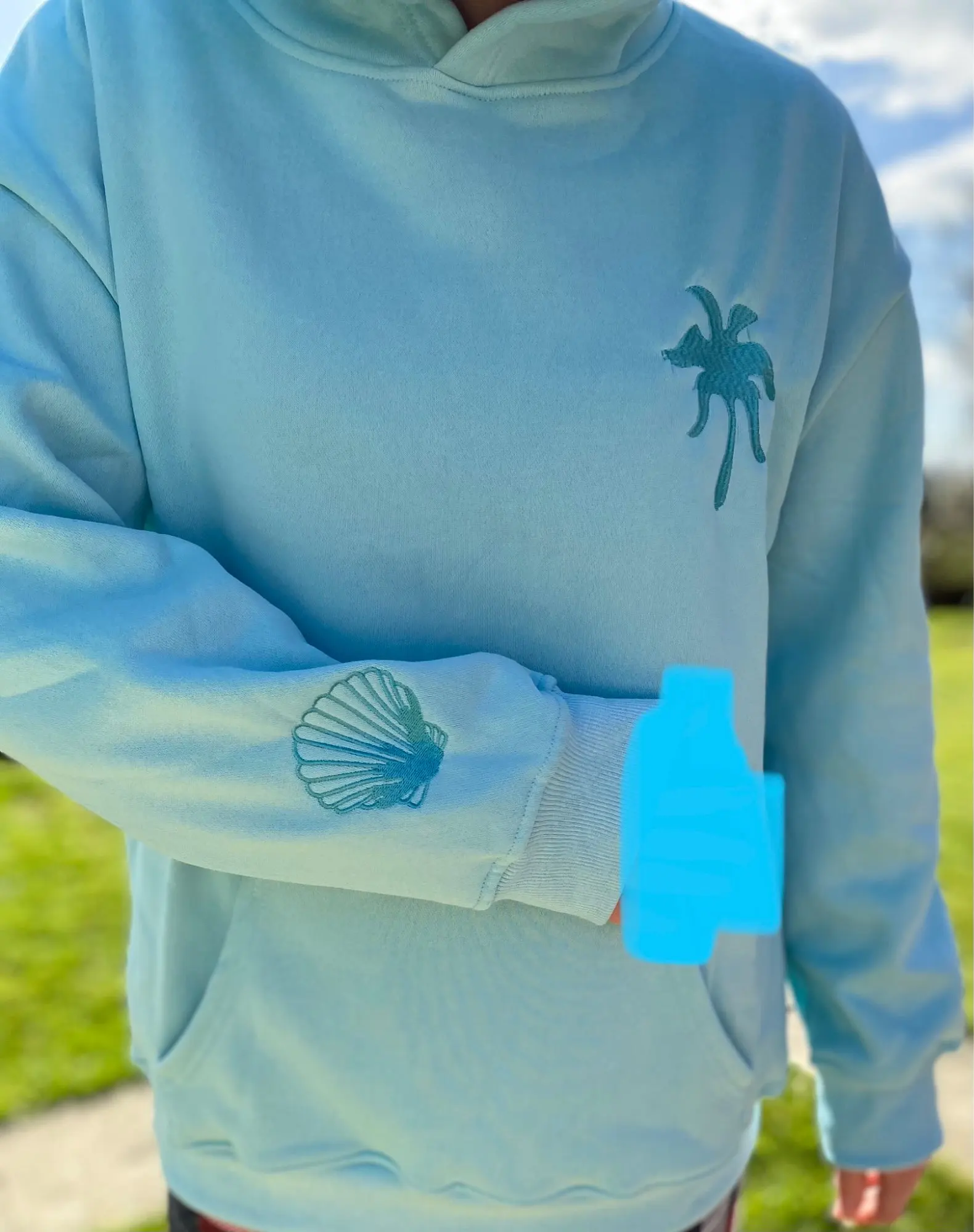 Beautiful detailed embroidered hawaiian hibiscus on back, embroidered shell on sleeve & embroidered palm tree on chest. This hoodie is awesome, very soft and thick. This superior seller did an awesome job and shipped super fast-arrived quickly 6 days after the order was placed. Highly recommend ordering from this seller. My daughter loved the first one we ordered so much that we ordered one for her friends birthday. Completely satisfied.