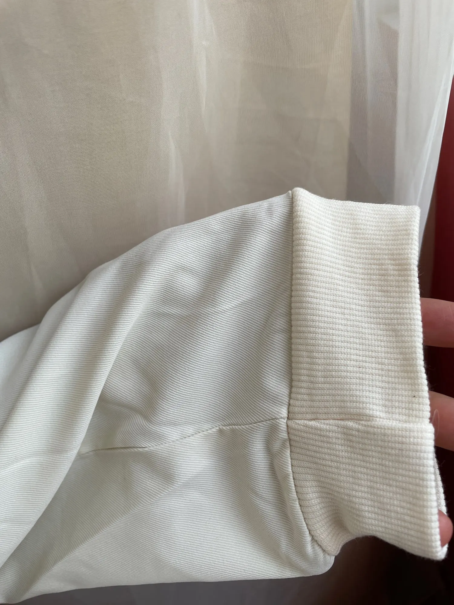 Didn’t like it, unlined sleeves, cuff fabric and bad, faded neck.